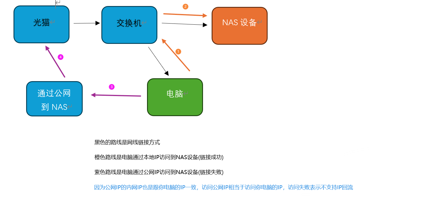 我家里的网络是带公网IP的,有一台NAS设备和几台电脑,家里所有的网络设备全部都连着交换机的,考虑到在外面可能会用到NAS,所以对NAS的端口进行了映射,映射好了之后,我断开家里的路由器尝试用移动数据进行连接公网IP的NAS,成功链接进去,之后我在用家里的电脑以同样公网IP的形式去访问NAS(注意,这个电脑跟NAS都是处于同一个局域网内),毫不意外,访问失败,拒绝链接请求。但是我用 192.xxx.xxx.xxx 本地IP去访问这台NAS,是可以正常进去的,这个大概就是我能描述的问题。