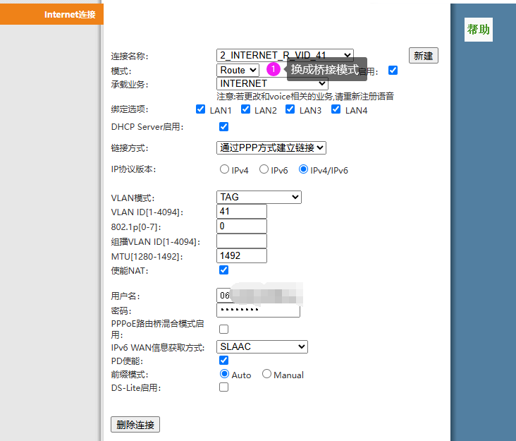 记住这个页面,或者截图下来,链接名称一定要选带 INERNET 字样的,模式 Bridge 为桥接模式,接着让路由器的线接入光猫后输入宽带账号密码进行拨号