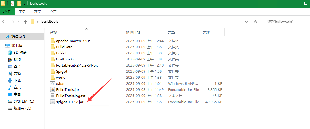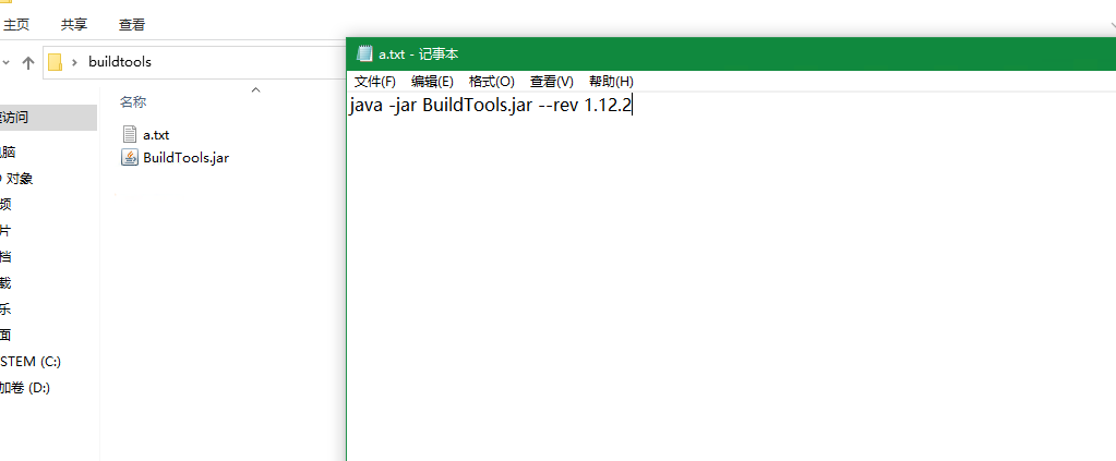 输入 java -jar BuildTools.jar --rev 1.12.2 1.12.2为版本号,可以自己输入想要的版本, 如果需要构建最新版本的,则把 --rev 1.12.2去掉即可,保存并将后缀的 .txt 改为 .bat 并双击打开bat文件