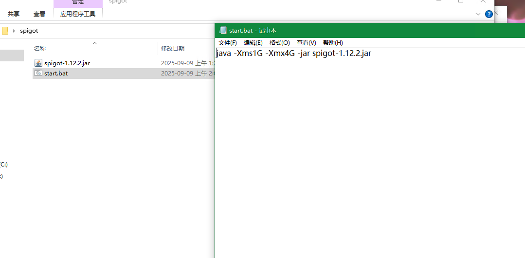 将构建好的 spigot 的核心,复制到另外一个全新的文件夹里面,再文件夹里面新建一个记事本,这里记事本命名随便起,我这里命名的是 "start" 接着再双击以记事本的方式打开,并输入 java -Xms1G -Xmx4G -jar spigot-1.12.2.jar 后进行保存,再将后缀 .txt 改为.bat