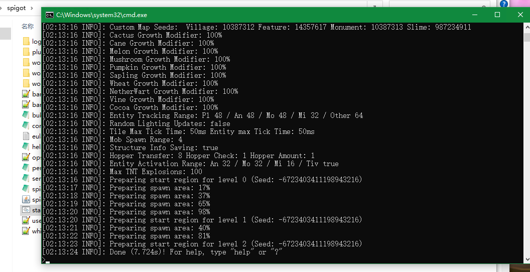 重新打开 bat 文件,等待加载即可,如下图,证明开服成功,需要关闭服务器请再窗口输入 stop