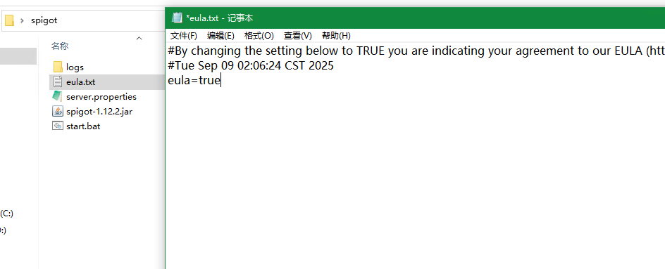 双击打开 bat 文件,将会生成一些文件后闪退,找到 Eula.txt 并以记事本方式或双击打开,将 eula=false 改为 eula=true,如下,保存并关闭