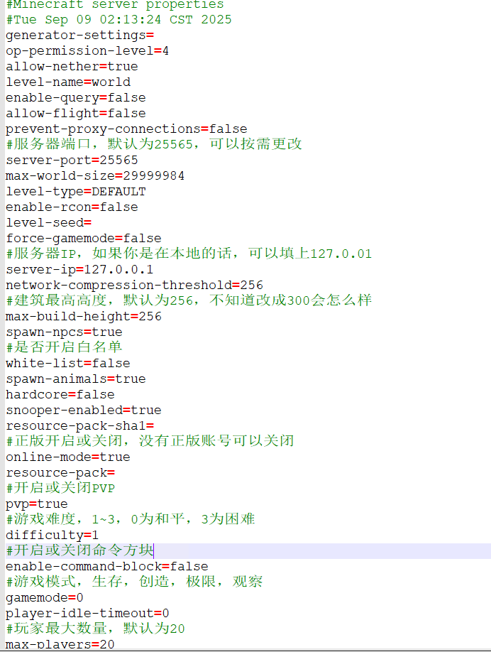 双击或以记事本方式打开 server.properties 文件,如果出现布尔值,则 false为关闭,true为开启