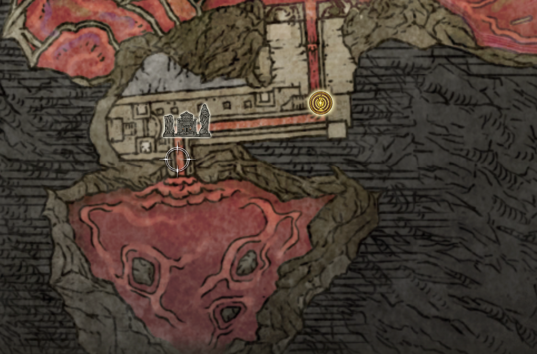 在赐福点把药瓶换成回血的,并准备好 腐败苔药 接着返回 腐败湖畔 的赐福点,大约半血就必须要喝红药,如果药瓶多,可以直接一路上到大殿门口,能撑到 大回廊 的赐福点即可,往左边走,进入石棺